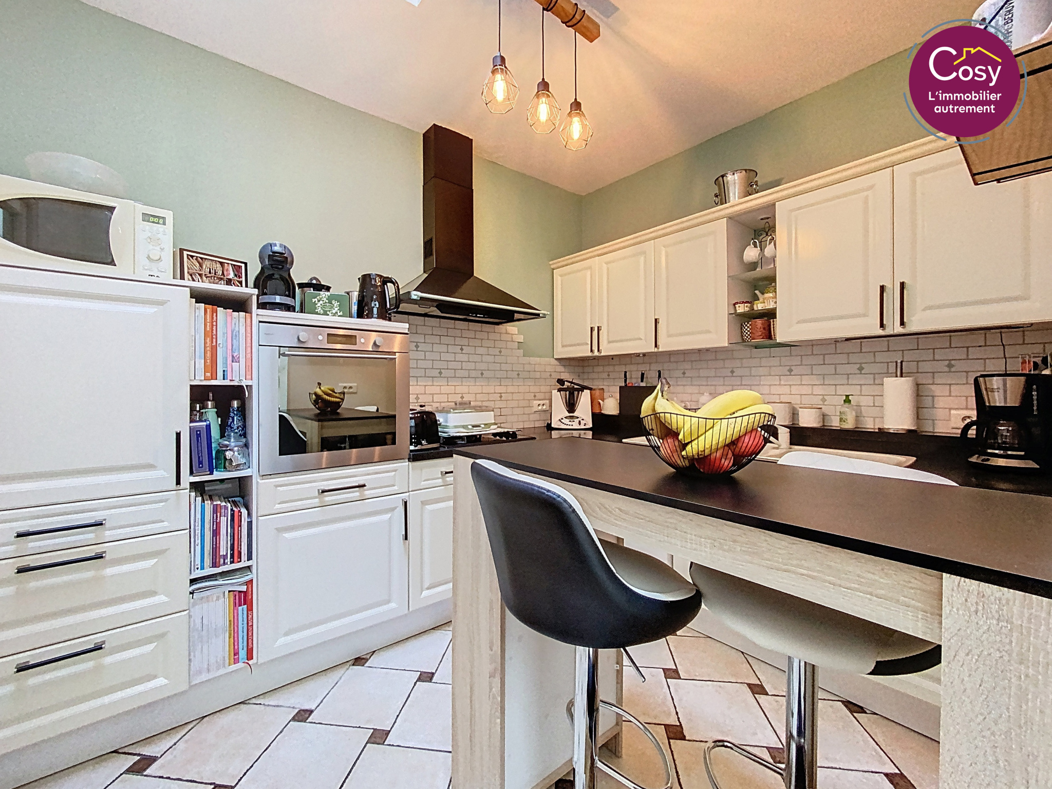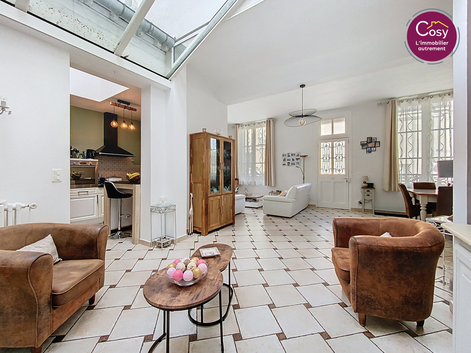 Derrière sa façade en pierre claire, on découvre 151 m² baignés de lumière, où le carrelage côtoie le parquet, les cheminées décoratives et une belle hauteur sous plafond. L’espace de vie s’organise autour d’un salon/séjour chaleureux prolongé par une verrière à l’esprit jardin d’hiver