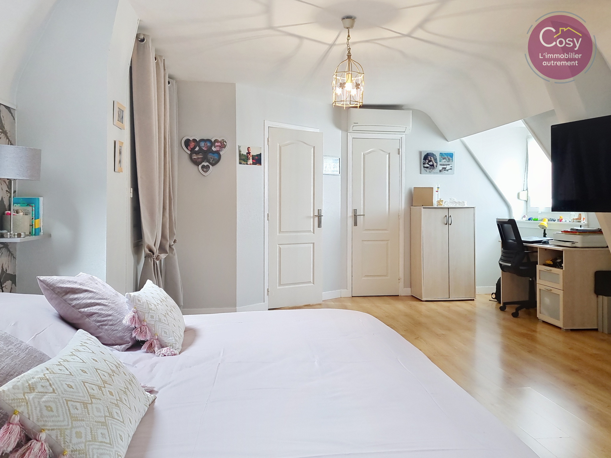 La distribution est fluide : deux chambres confortables se partagent un niveau, tandis que le dernier étage abrite une suite parentale pleine de caractère. Véritable cocon perché sous les toits, elle bénéficie d’une vue exceptionnelle, rare en cœur de ville.