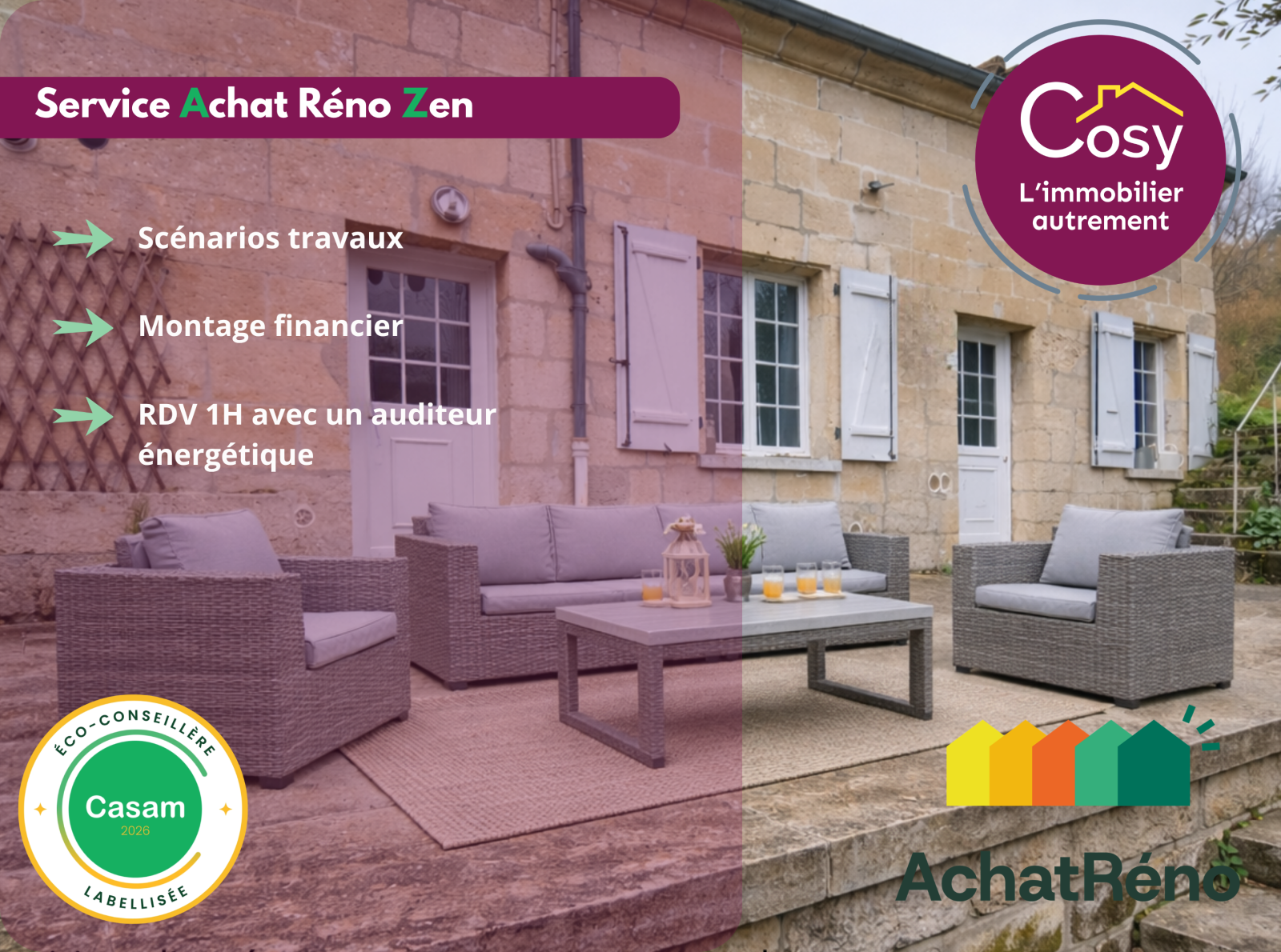 • Accompagnement Achat Réno : devis, stratégie travaux, validation pour les primes, montage du financement