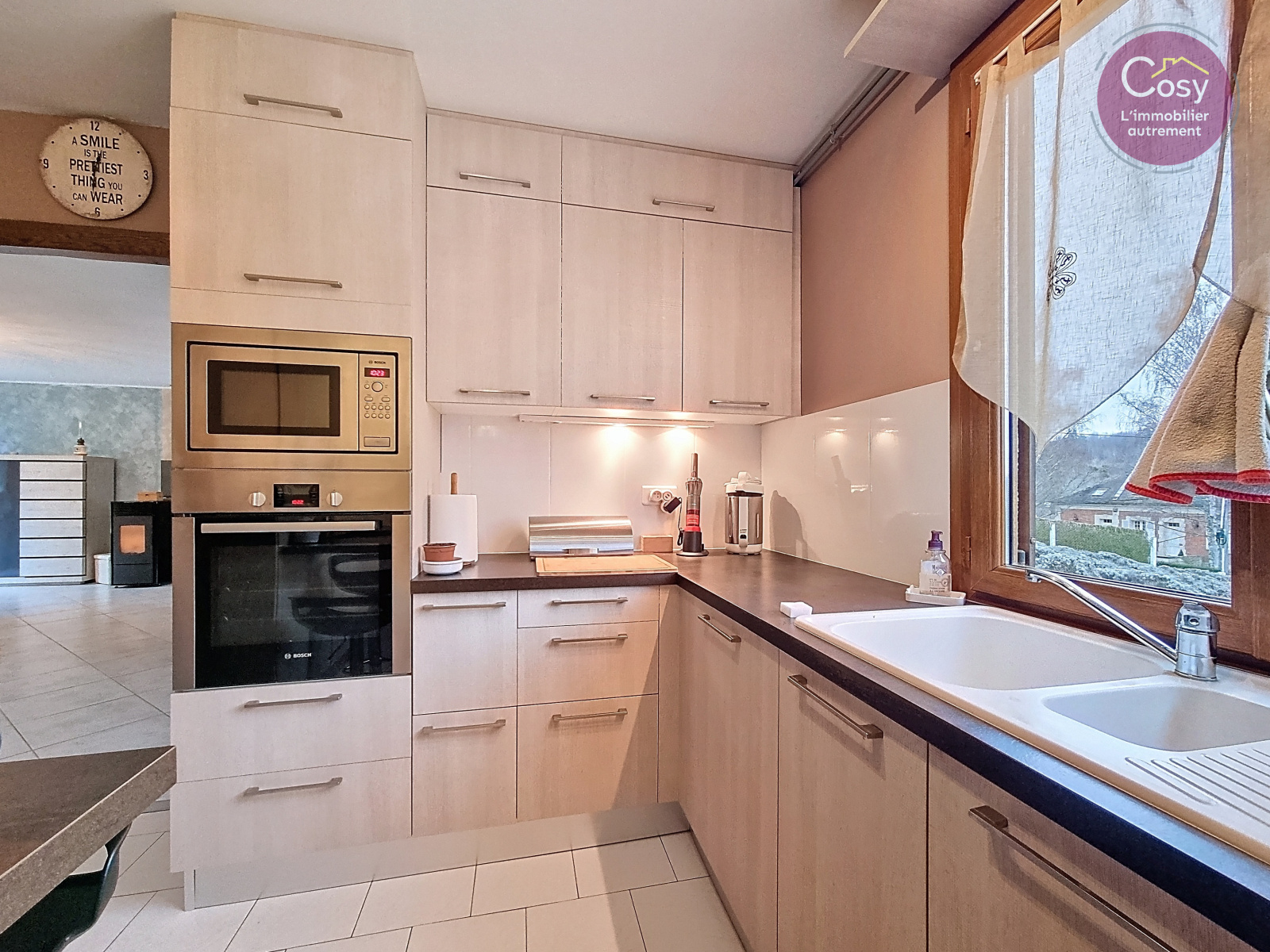 La cuisine aménagée et équipée invite à la convivialité et au quotidien facile.